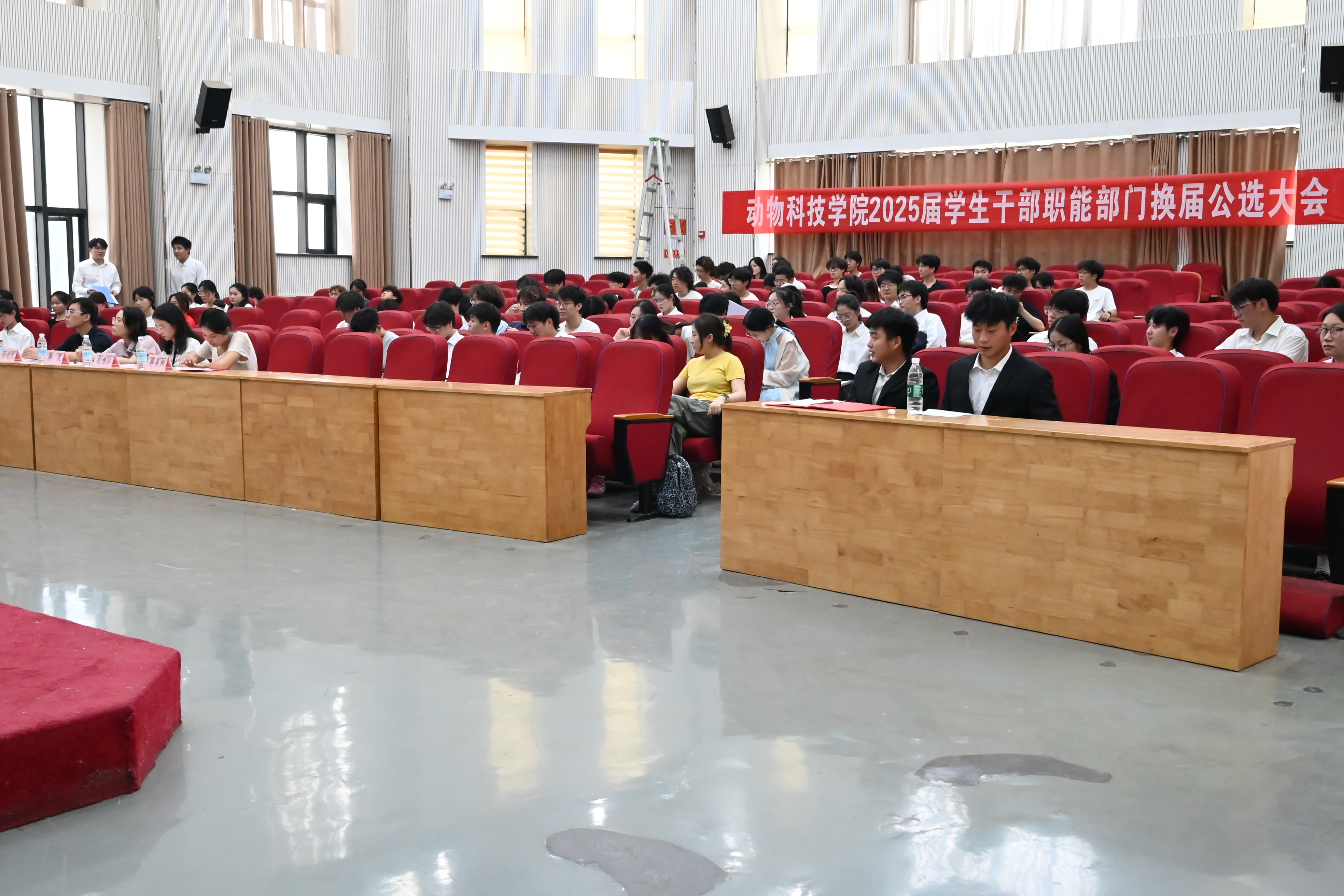 于龙子湖校区繁塔楼大教室七召开2025届学生干部职能部门换届公选大会,院组织员兼团委书记韩笑、院团委老师赵姝灿、杨超然及兼职辅导员韩易桐,院各学生组织、班干部代表参加会议。