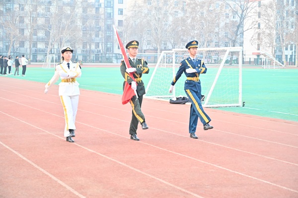在全体师生的注视下,国旗护卫队迈着坚定有力的步伐将国旗护送至升旗台,伴随着慷慨激昂的《义勇军进行曲》奏响,五星红旗冉冉升起。全体师生神情肃穆,向着国旗行注目礼,眼中满含对祖国的敬重和热爱。