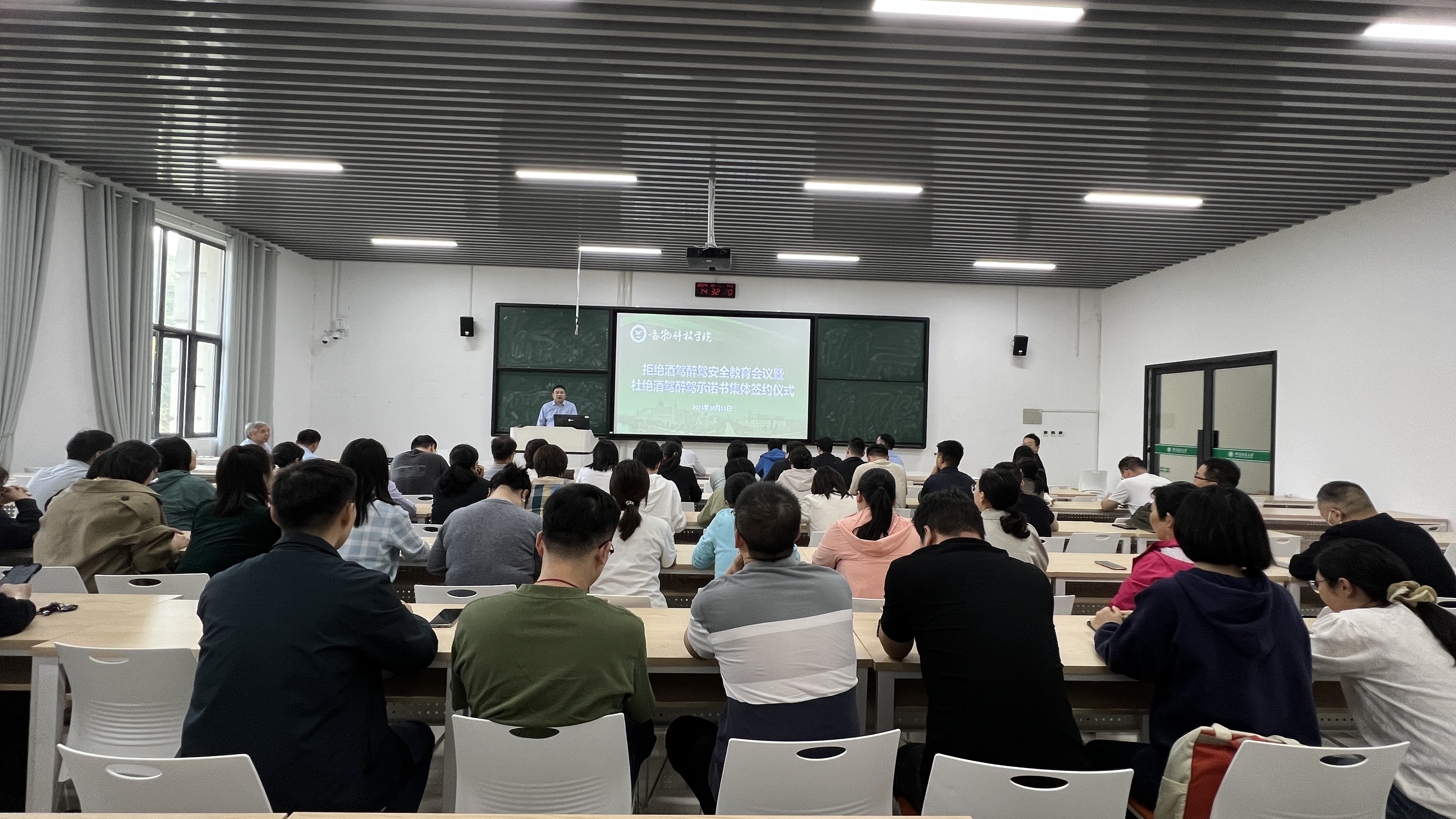 于10月15日在龙子湖校区第二实验楼中130教室举办拒绝酒驾安全教育会议暨杜绝酒驾醉驾承诺书集体签约仪式,院领导班子、全体教职工参会。