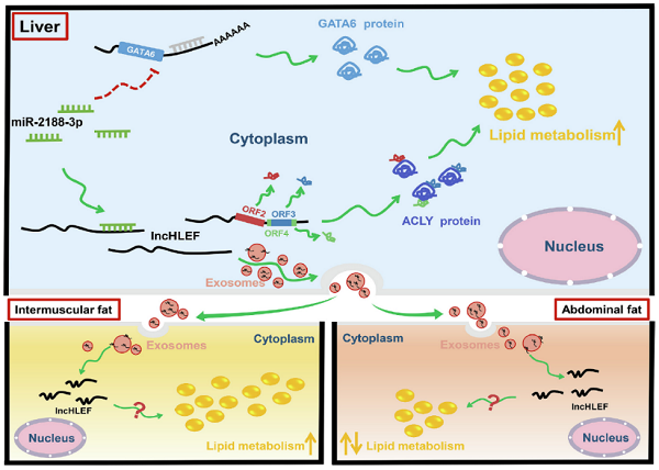 肝脏是鸡脂质代谢的主要器官,但有关鸡肝脏脂质代谢的调控机制,特别是长链非编码RNA(lncRNA)在这一过程中的作用机制依然不清。为此,课题组通过对产蛋前期和高峰期母鸡肝脏全长转录组分析,系统研究了鸡肝脏lncRNA与脂质代谢的关系,并鉴定出一个可促进肝细胞脂滴形成、甘油三酯和总胆固醇合成的基因间lncRNA lncHLEF。体外试验分析表明,lncHLEF不仅可以作为竞争性的内源性RNA调节miR-2188-3p/GATA6轴,还可编码3个功能小肽直接增强ACLY蛋白的稳定性,进而促进脂质合成。腺相关病毒介导的肝特异性lncHLEF过表达活体试验表明,lncHLEF可促进肝脏脂质合成,同时通过外泌体形式转运lncHLEF,从而促进肌内脂肪(IMF)沉积,但不改变腹部脂肪(AbF)沉积(图1)。该成果 “LncHLEF promotes hepatic lipid synthesis through the miR-2188-3p/GATA6 axis and encoding peptides, and enhances intramuscular fat deposition via exosomes” 以研究论文形式在线发表于国际著名期刊《International Journal of Biological Macromolecules》(中科院一区)。百家乐玩法