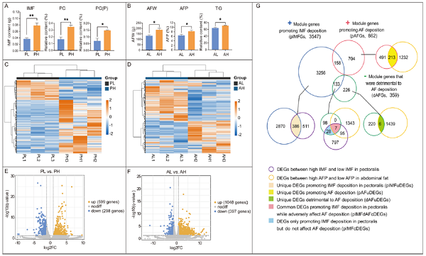 在鸡肉生产中,肌肉内脂肪(IMF)沉积有利于肉质的提升,而腹部脂肪(AbF)沉积却导致饲料浪费和环境污染。然而,IMF和AbF之间脂质组成的异质性和差异性沉积机制仍不清楚。课题组首先利用非靶向脂质组学技术,对地方鸡固始鸡胸肌IMF和AbF的组成成分进行了分析,共检测到423个鸡IMF和AbF之间的差异脂质分子(DLM),并确定了28种导致IMF和AbF异质沉积的主要DLM,通过加权基因共表达网络分析(WGCNA)将转录组与主要DLM进一步整合分析,发现了5个关键基因集,包括386个促进胸肌IMF沉积的特异性基因、213个促进AbF沉积的特异性基因、6个对AbF沉积不利的基因、7个促进胸肌肉IMF沉积但对AbF沉积有不利影响的基因以及28个仅促进胸肌IMF沉积但对AbF沉积没有影响的基因。这些发现为理解IMF和AbF差异性异沉积提供了新视角,并为通过育种选择提高肉质提供宝贵的信息资源(图4)。该成果 “Integrated LC/MS-based lipidomics and transcriptomics analyses revealed lipid composition heterogeneity between pectoralis intramuscular fat and abdominal fat and its regulatory mechanism in chicken” 以研究论文形式在线发表于国际著名期刊《Food Research International》(中科院一区)。百家乐玩法