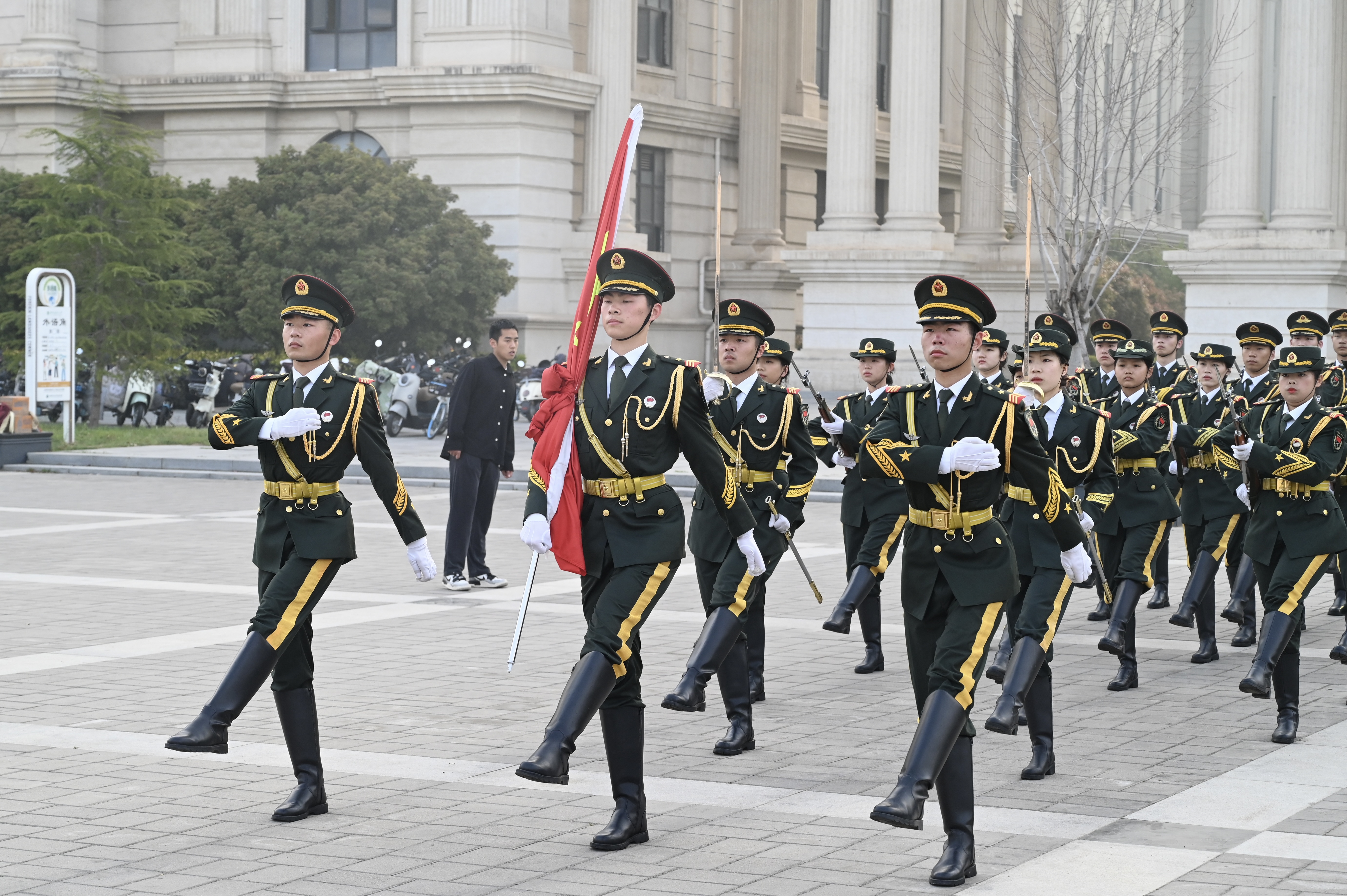 在全体师生的注视下,国旗护卫队踏着铿锵有力的步伐将国旗护送至升旗台,五星红旗伴随着激昂奋发的《义勇军进行曲》冉冉升起,随风飘荡。在场师生神情肃穆、向国旗行着注目礼,眼中饱含对祖国深沉的热爱与崇高的敬意。