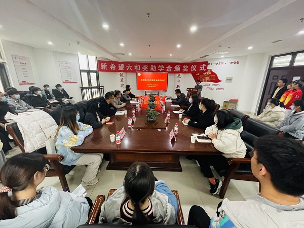 关于颁发新希望六和奖助学金的决定》。获奖教师魏云、韩笑等5人以及获奖学生赵金燕、张倩等20人上台领取奖助学金并合影留念。