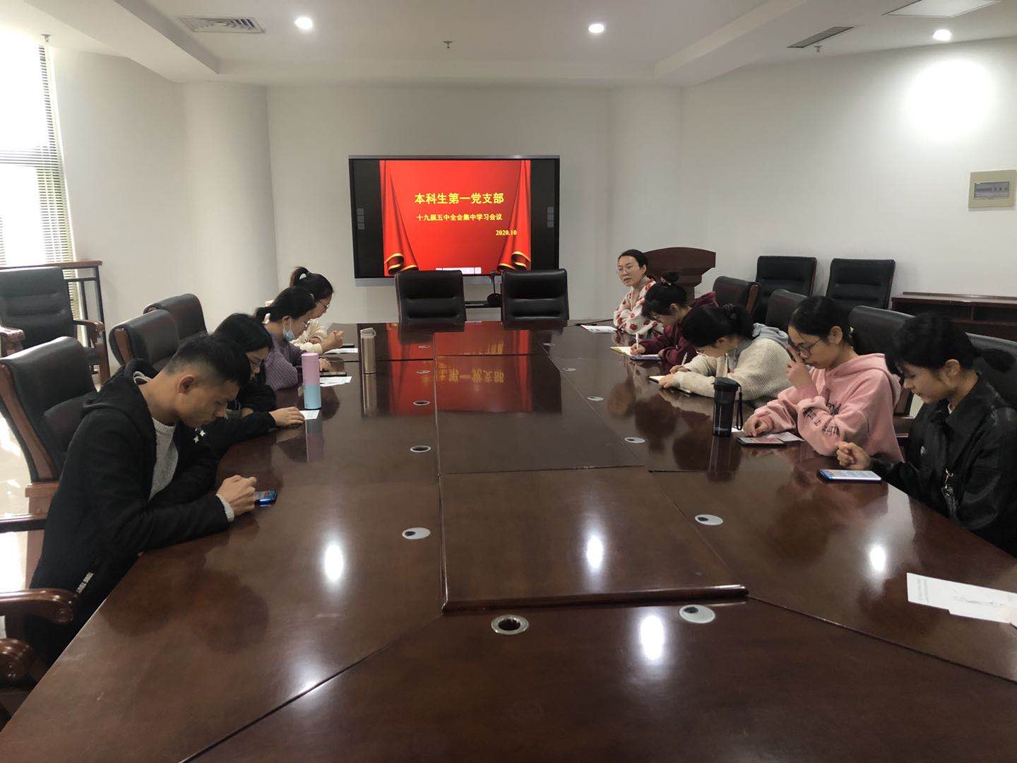 在各团支部中开展“学习党的十九届五中全会精神”主题团日活动,引导学生齐交流、话感悟,在党支部中,要求支部书记带头学精神、践要求,并通过支部内部集中学习、互相交流,明形势、担使命。