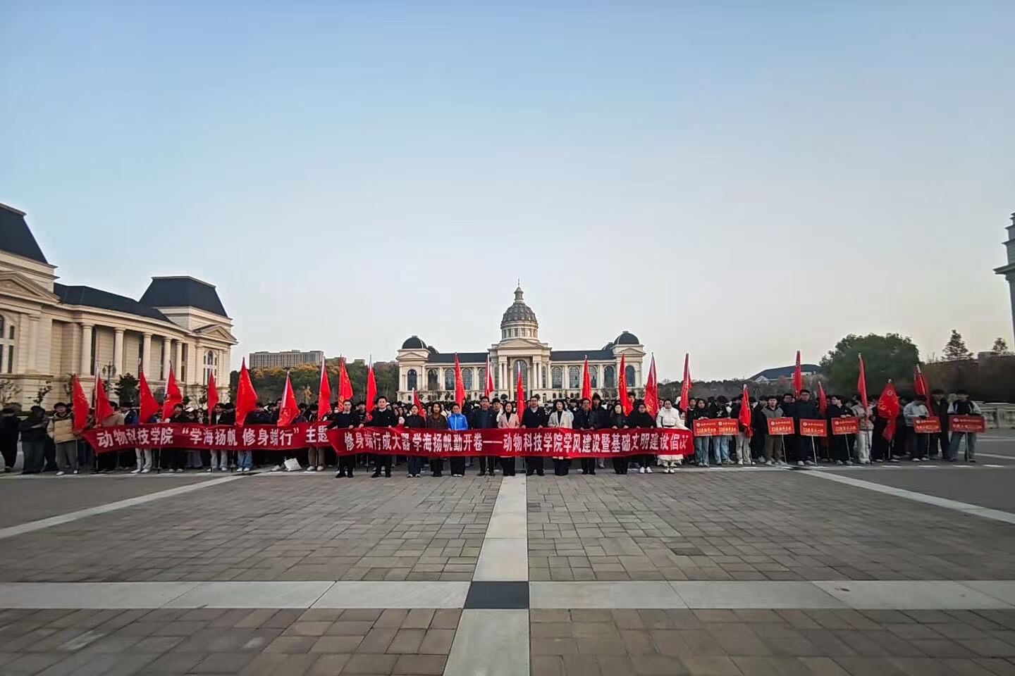 院长田亚东对师生提出殷切期望:一要胸怀家国,在“学海扬帆”中坚定理想信念;二要勤思笃行,练就过硬本领;三要修身端行,以良好品行奠定人生基石。最后,他呼吁师生以这次升旗仪式为新的起点,把爱国情、强国志融入报国行的具体实践中,为我国畜牧业现代化和乡村振兴事业做出应有贡献。