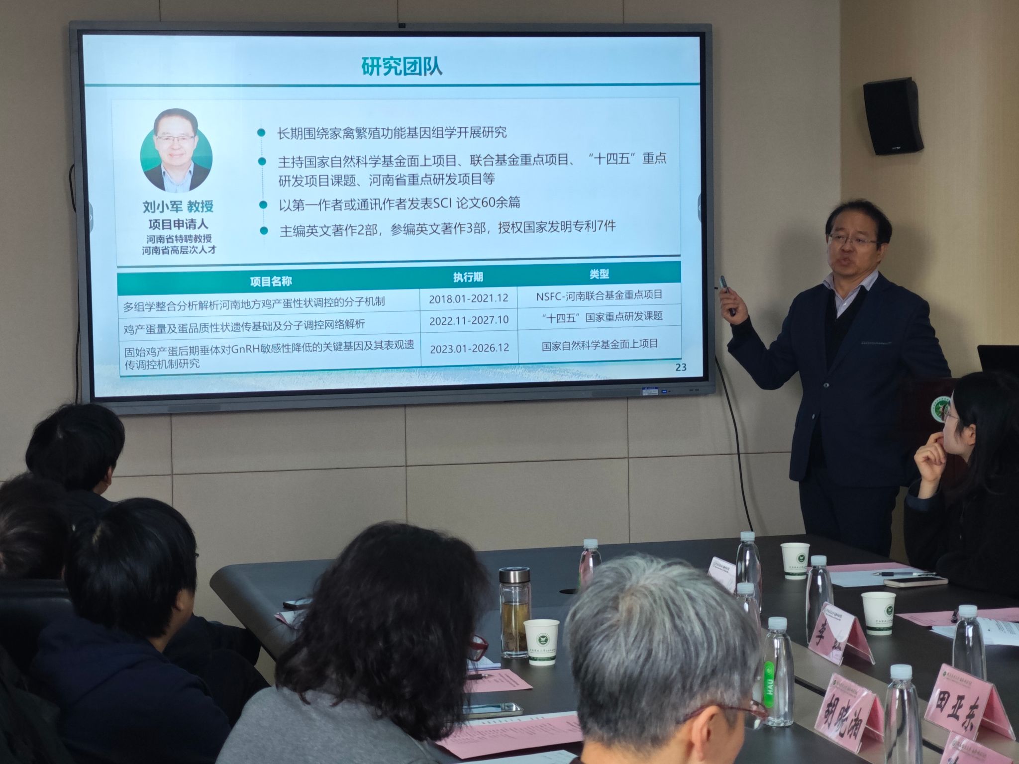 启动会上,刘小军教授就主持的“鸡肝脏和腹脂特异性内分泌因子通过组织间通讯调控产蛋量性状的分子机制” 项目作汇报。该项目聚焦我国地方鸡产蛋性能偏低、种鸡主导品种依赖进口的产业痛点,突破传统研究局限,旨在揭示肝脏与脂肪组织通过内分泌因子介导的组织间信号通讯调控性腺轴的分子机制,为优质高产特色蛋鸡新品种选育提供理论支撑与技术路径。项目将运用 iSLET 生物素标记、多组学整合分析等多学科交叉技术,从分子、细胞到机体层面解析调控网络,挖掘产业化应用潜力。