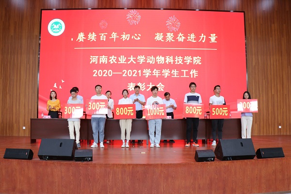在欢快的乐曲中,与会领导为获奖集体及个人依次颁奖并合影留念,先进集体代表、2018级动物科学2班班长韩振涛和先进个人代表、校级三好学生、2018级动物科学4班张雨时同学作交流发言。