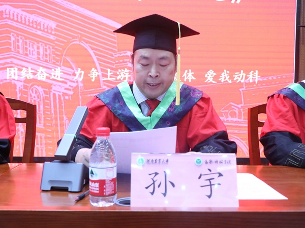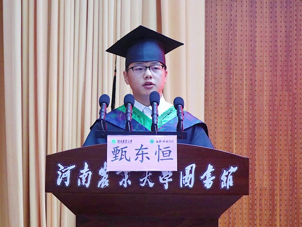 本科毕业生代表、2021级动科2班甄东恒发言,他向为搭建成长成才平台的最美动科致以最真挚的感激,向悉心栽培、传道授业解惑的最美老师致以最诚挚的敬意,回顾大学生活,初心如磐,在党旗下成长,科研追梦,在探索中突破,知行合一,在实践中不断超越,呼吁大家无论走向何方,都能以强农兴农为己任,在祖国最需要的地方绽放青春。