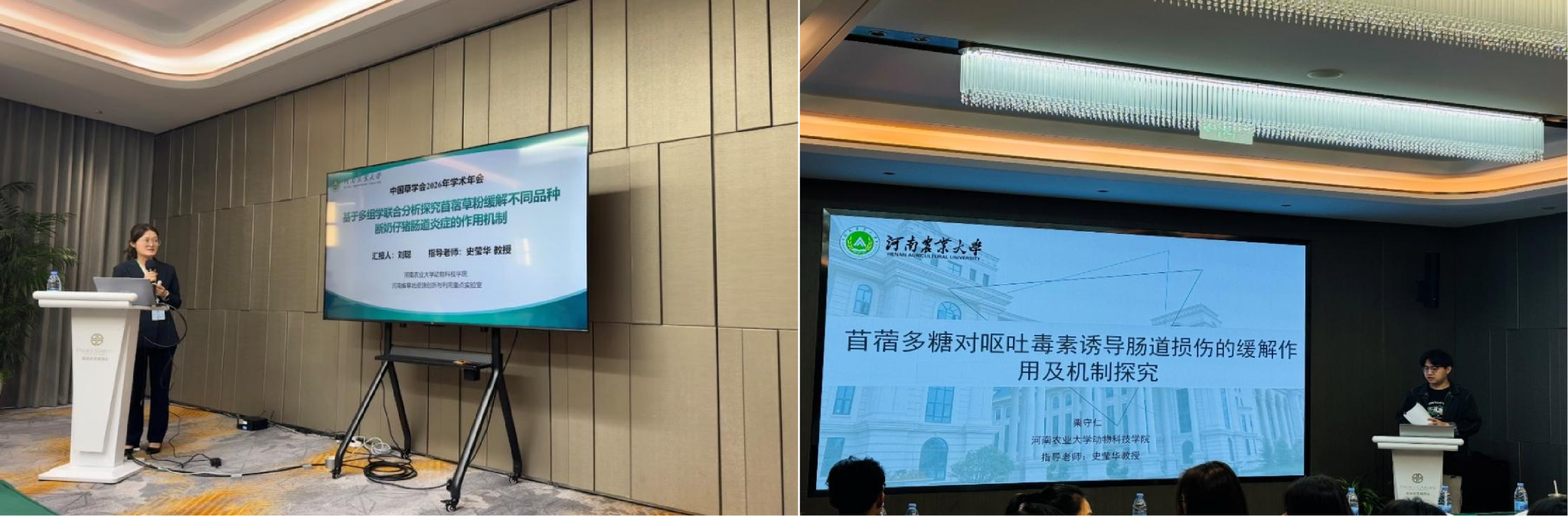 此外,史莹华教授指导的博士研究生刘聪、栗守仁,分别在研究生专项论坛作学术报告,聚焦苜蓿资源化利用、畜禽肠道健康等研究方向,立足畜牧行业减抗提质发展需求,分享最新研究进展,为畜牧业绿色低碳发展提供数据支撑与理论依据。其中,刘聪获本次年会博士研究生学术交流报告 C 类奖项。