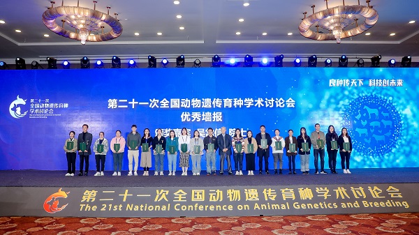 本网讯(通讯员 张彦华)10月13-17日,第二十一次全国动物遗传育种学术讨论会在北京举办,百家乐玩法 组织50余位教师和研究生参会学习。其中黄艳群教授、李文婷副教授、许会芬老师和李志超博士研究生分别做专题报告分享科研成果;李文婷副教授的论文《基于泛基因组解析鸡生长性状主效基因IGF2BP1原因突变》荣获“优秀论文奖”;2021级博士研究生李志超的论文《微生物组-代谢组分析伊普吕肉兔盲肠内容物及软硬粪的免疫微环境》荣获“青年学者旅行奖”;2021届硕士毕业生唐贺贺的论文《鸡血清碱性磷酸酶(ALP)标签SNP的鉴定》荣获“优秀墙报奖”。