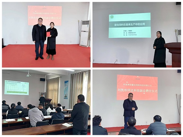 在参会嘉宾的见证下,董总为刘凯珍博士颁发科技副总聘书。随后,刘凯珍博士以《膨化饲料在畜禽生产中的应用与前景》为主题作专题报告,系统阐述了膨化饲料营养价值提升、动物肠道健康改善及养殖效益优化的关键作用,并结合行业趋势提出技术突破方向,引发与会企业代表与科研人员的强烈共鸣。