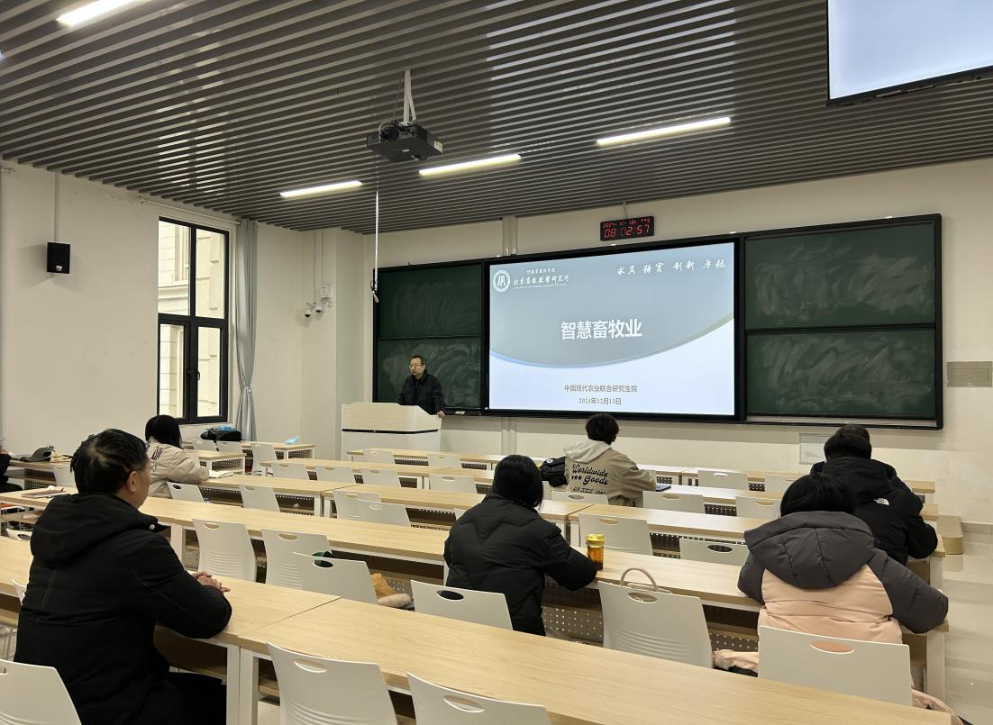 杨亮研究员以《智慧畜牧业》为题。首先,介绍了我国生猪产业发展现状以及人工智能在生猪养殖过程中的应用。随后,杨亮研究员又详细阐述了楼房养猪—人工智能体的运行模式,例如整体联网与通讯系统、整体生物安全防控系统等,人工智能系统在畜牧业应用的先进与便捷引起了在场师生的极大兴趣。最后又与同学们分析了我国牛羊产业存在的一系列问题,如何提高生产效率、降低饲料日粮的浪费、改善我国牛羊的健康状况、完善疾病防控措施成为当下我们亟待解决的必要性、紧迫性问题。