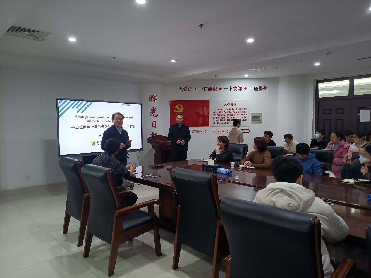 姜雨教授介绍了全球瘤牛品种起源与迁移、鉴定大效应变异的分子育种、基因组结构变异的鉴定、低深度重测序技术及其在全基因选择的应用情况以及构建基因组数据库等,为探索家禽资源的起源进化及迁移,地方鸡全基因组选择技术提供新的思路。最后,姜雨教授解答了与会师生提出的问题和困惑。