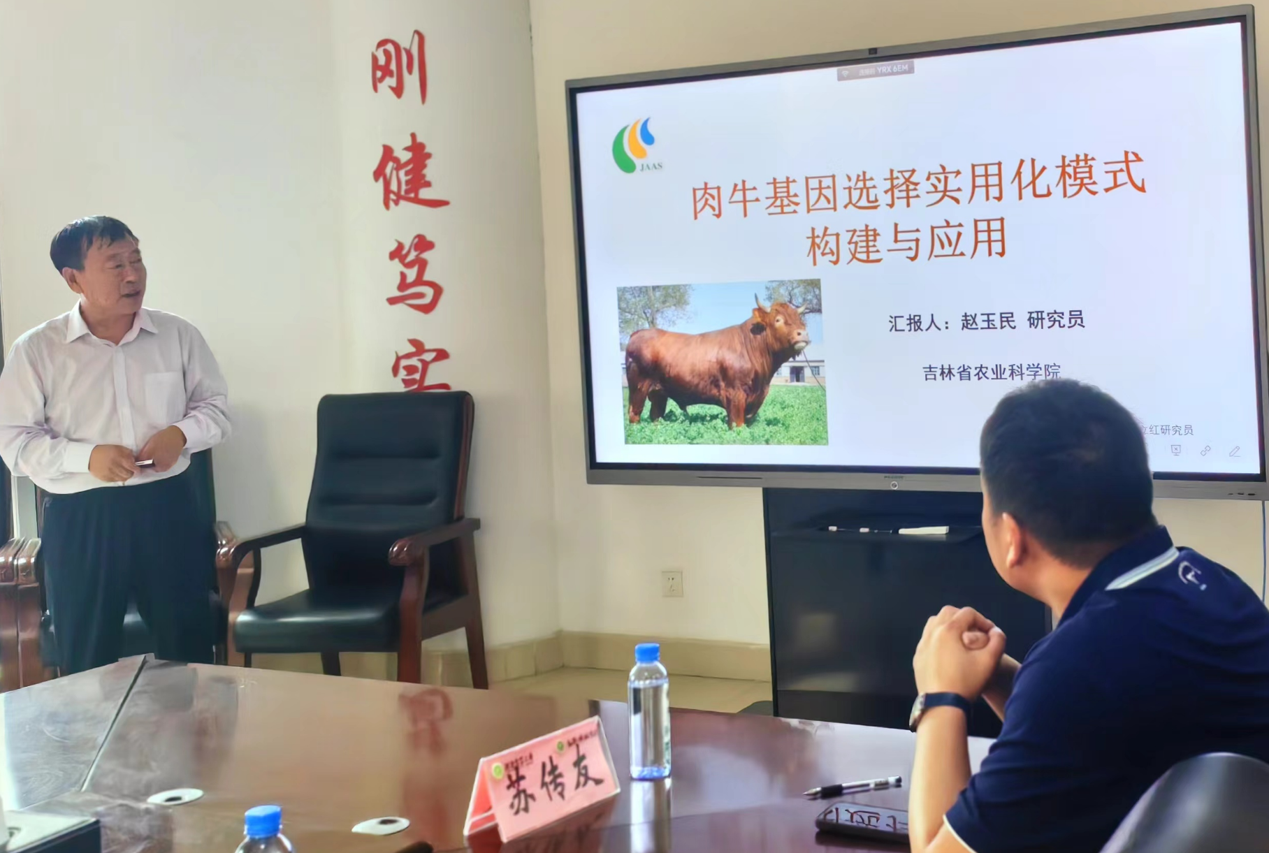 赵玉民研究员做了题目为《肉牛基因选择实用化模式构建与应用》的学术报告。赵老师从我国牛肉产需缺口持续扩大的产业背景出发,指出良种是肉牛产业健康持续发展的物质基础,进而提出分子育种的思路,并分享了其课题组取得的阶段性成果,最后对分子育种的技术与产业如何有机融合指明了研究方向。