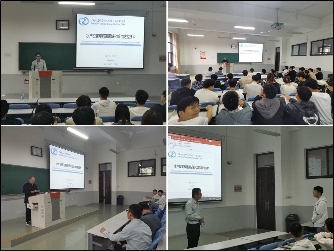 巩华副研究员以《水产疫苗与病害区域化综合防控技术》为题,以幽默风趣的语言为现场师生讲述了水产病害临床诊断、水产疫苗使用现状与研究进展、水质调控和现代化工厂化水产养殖技术等知识,并且通过详实的案例,系统介绍了珠江所在鱼类免疫系统的研究,特别是在水产疫苗方面取得的丰硕成果,并在此基础上,发展了病害防控技术形成区域化管理技术体系。在互动环节,巩老师详细解答了师生的提问。