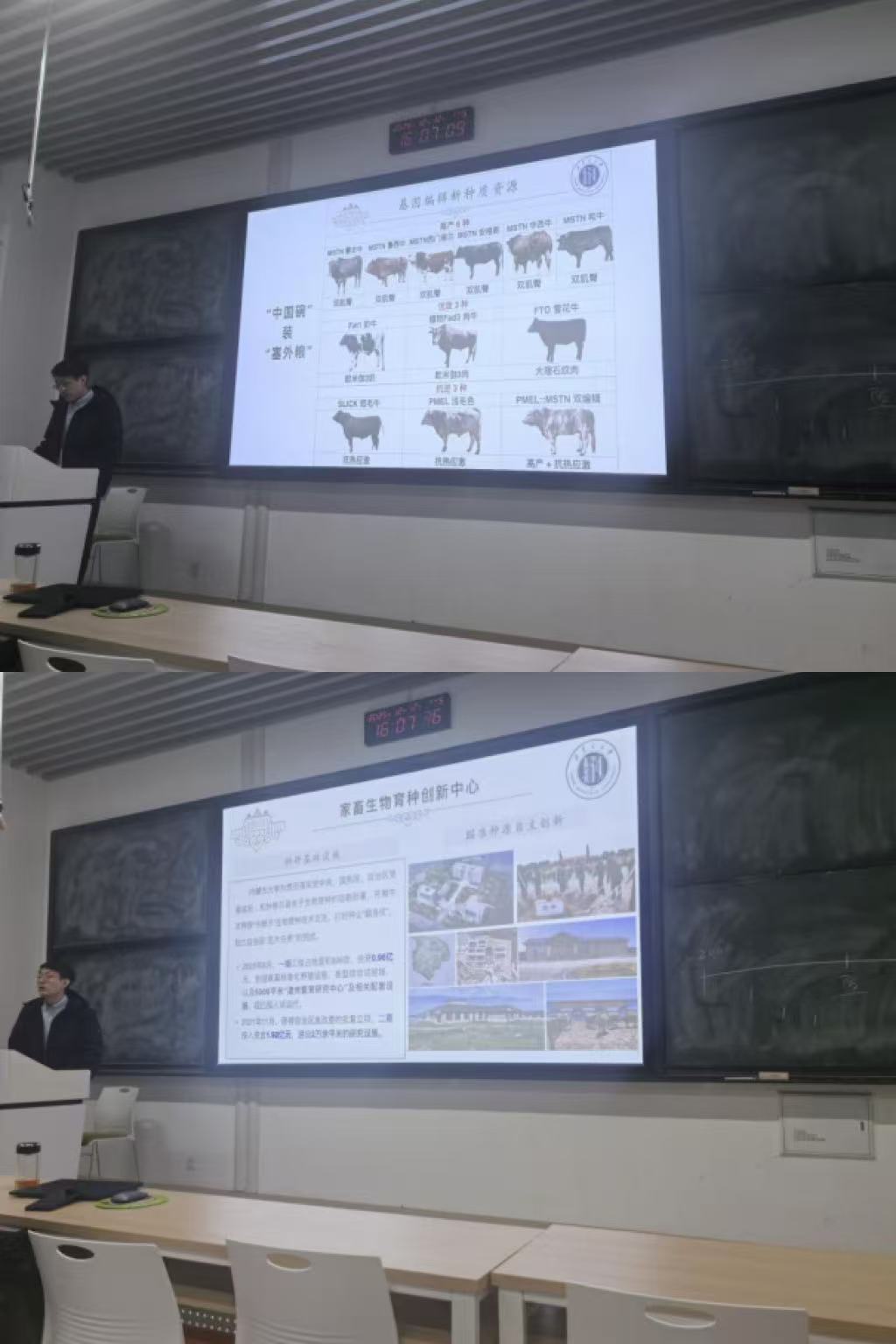 报告会上,杨磊结合自身科研经历,阐释了科研工作中的坚持与探索精神。他从基因编辑牛羊生产的应用场景切入,系统讲解牛羊单倍体育种的核心策略,并紧扣牛羊生物育种高质量发展需求与瓶颈,分享了团队在肉牛高产、优质、抗逆三大类型的新种质培育核心成果。期间,杨磊教授还介绍了内蒙古大学家畜生物育种创新中心的建设进展,并勉励同学们未来加入团队共同学习成长。